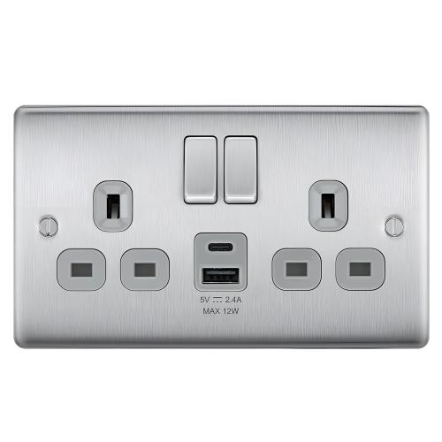 2 Gang Brushed Steel Socket with USB A and C Charger Output